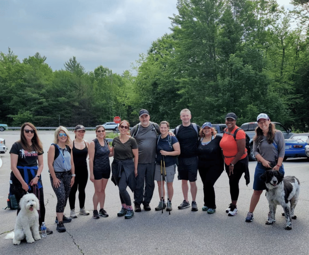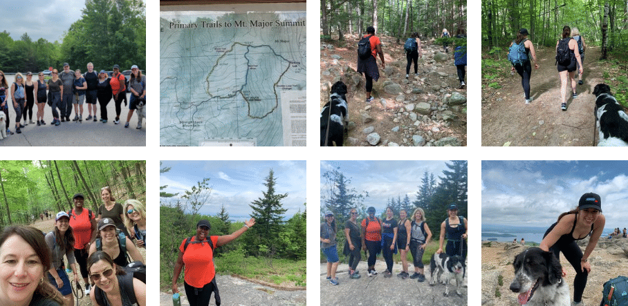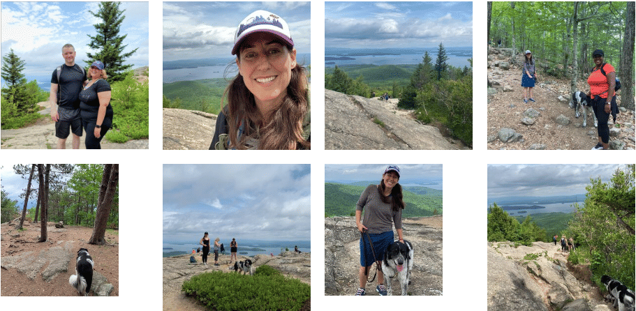 On Saturday, we got up early and drove to meet the ladies (and gents) from the New England HIMSS chapter who had signed up to hike with us. It was the largest group yet and the toughest hike weāve attempted on the journey so far. Although itās labeled āModerateā on AllTrails, we all agreed this hike felt a bit more advanced. For some, this was the first exercise activity that theyād participated in since before the pandemic. It was a long uphill and rocky climb for the first two thirds on the way up to the summit and steep on the way back down. Some of us were huffing and puffing, including Juno, who loves climbing rocks and being the leader of the pack. But, the views of Lake Winnipesaukee and the White Mountains at the top were 100% worth the effort.